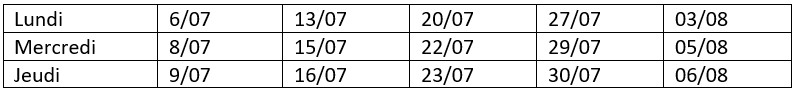 30 heures, du 1er au 30 juillet (voir le calendrier ci-dessous), lundi – jeudi (+3 vendredis), 10h-11h30, avec Leslie.