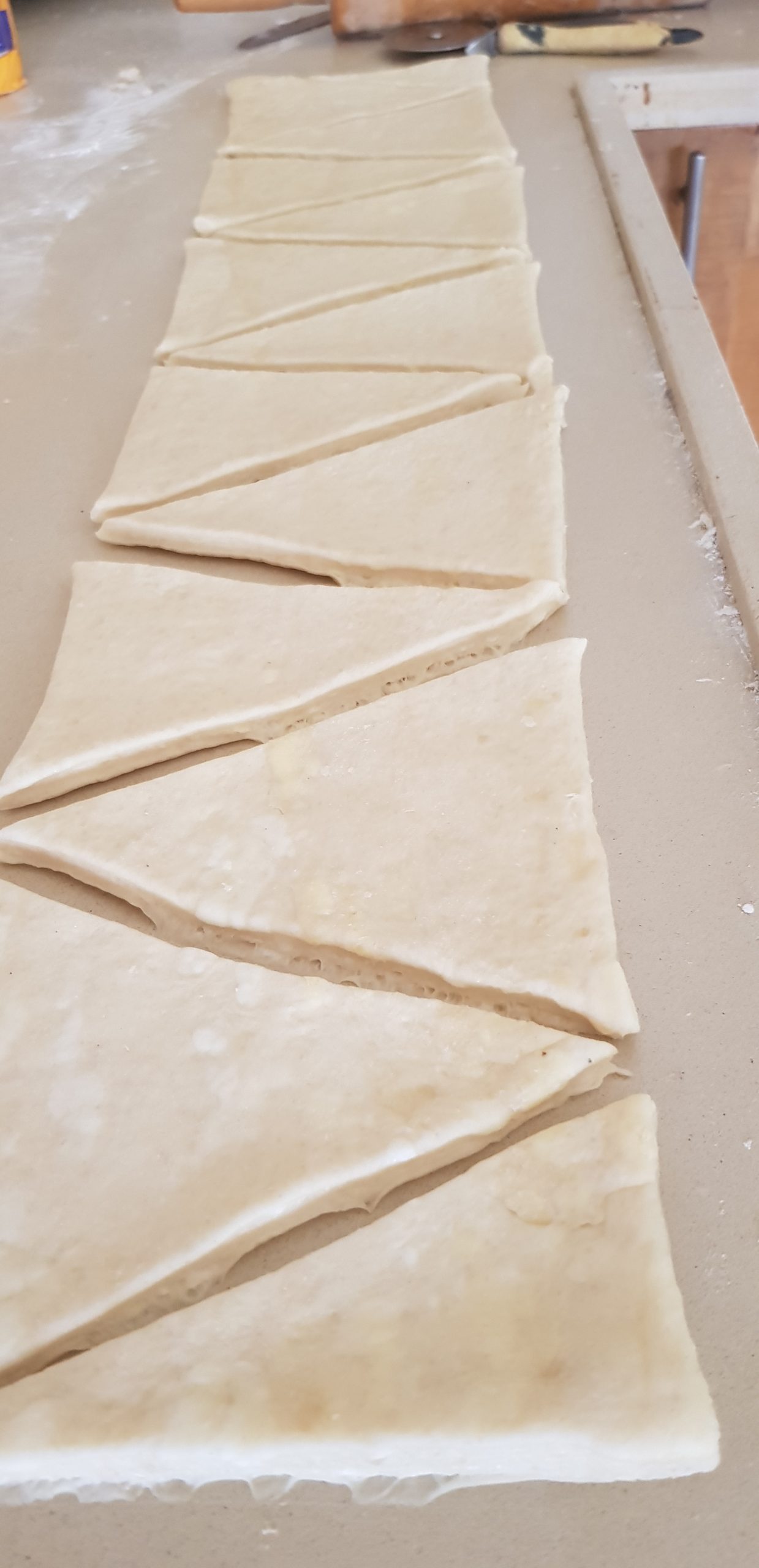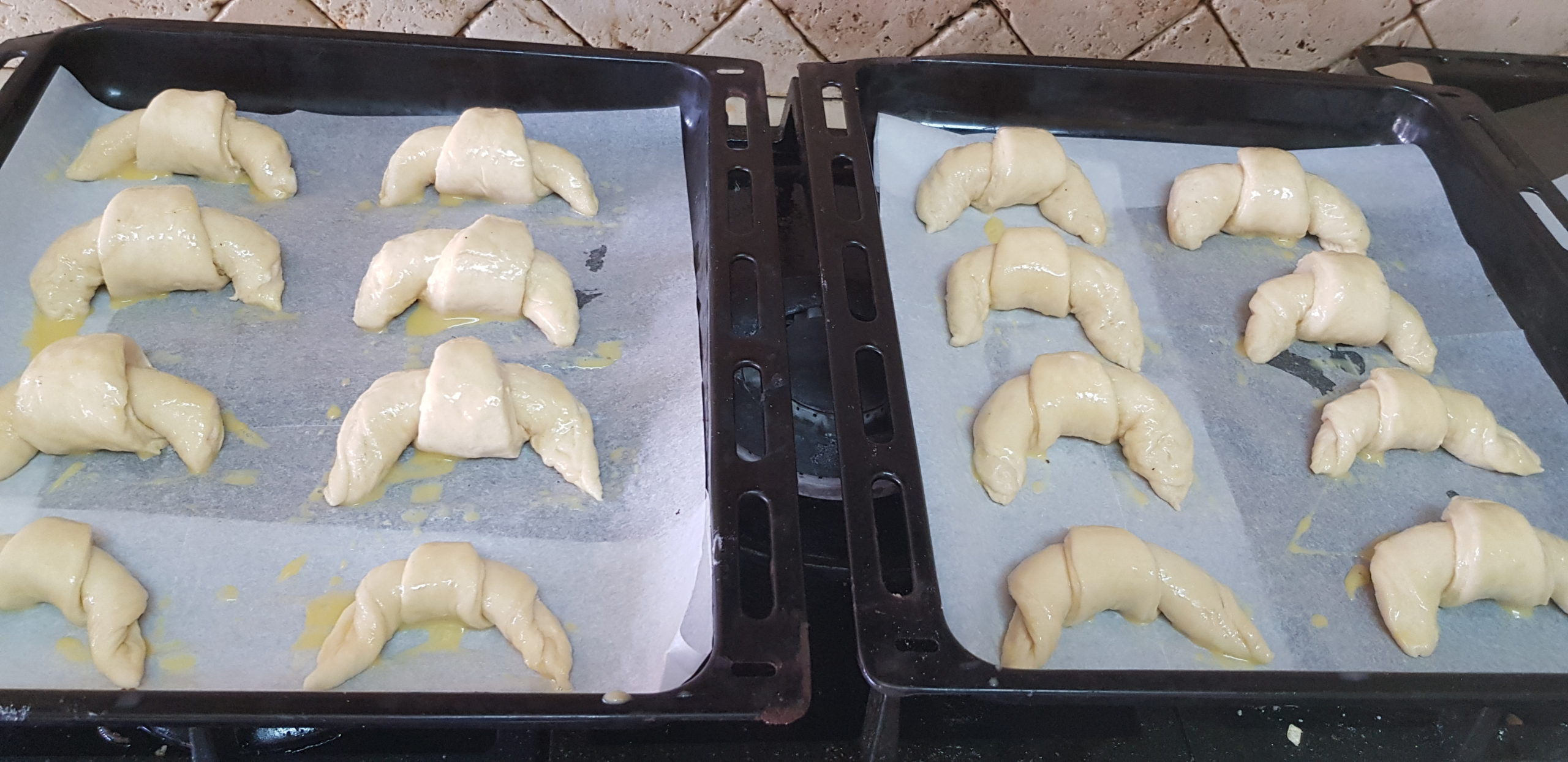 Quand le beurre a bien pénétrée la pâte , faire des bandes et des triangles et rouler vos croissants, les laisser monter et les badigeonner et mettre au four chaud à 240 °