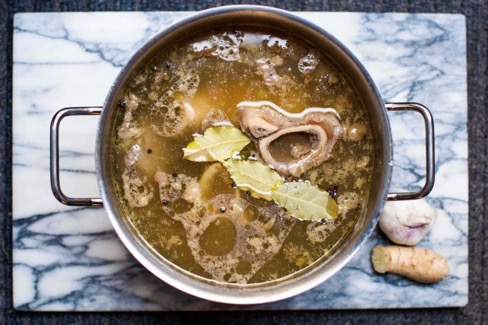 La moelle osseuse apporte la vitamine A, la vitamine K2, des oméga-3, des oméga-6 et des minéraux comme le fer, le zinc, le sélénium et le manganèse. Le tissu conjonctif (cartilage, peau) fournit de la glucosamine et de la chondroïtine, pour lutter contre l’arthrite et les douleurs articulaires. Par ailleurs, les os, la moelle et le tissu conjonctif sont en grande partie constitués de collagène, qui a une très forte concentration en glycine (un précieux acide aminé). Et l’excellente nouvelle est que le bouillon d’os, un temps remisé au rang des vieilleries de grand-mère, revient furieusement à la mode ! Les chroniqueurs gastronomiques l’adulent. Aux Etats-Unis, de New-York jusqu’à la côte ouest, des Bones Broth Bars - Bars à bouillon d’os - ouvrent à tour de bras1. Il paraît même qu’à Portland, à l’angle du 115 Northeast et de la 6ème avenue, on se bouscule « dès potron-minet pour prendre ce bouillon, une vraie potion magique à 5 dollars, à base de carcasses de poulet, de bœuf, de dinde, de porc ou de bison, élevés en plein air dans des fermes de l’Oregon et nourris sans antibiotique ni OGM ». C’est la folie du bouillon d’os ! Alors mode ou pas mode, peu importe, on retiendra surtout la pertinence de ce retour aux fondamentaux de la nutrition, avec des vertus du collagène et de la glycine qui ont été ré-affirmées par les toutes dernières études scientifiques, recensées sur son blog par le journaliste Julien Venesson2 :
